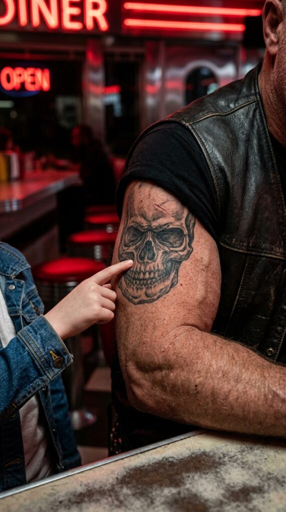 Una niña de no más de diez años, vestida con una sencilla chaqueta vaquera y con el cabello oscuro recogido en una coleta, se había acercado en silencio. Su rostro era de una calma inquietante, casi inexpresiva. Sin previo aviso, la pequeña levantó su dedo índice y señaló directamente al hombro del motociclista, justo donde descansaba el intrincado tatuaje de una calavera.