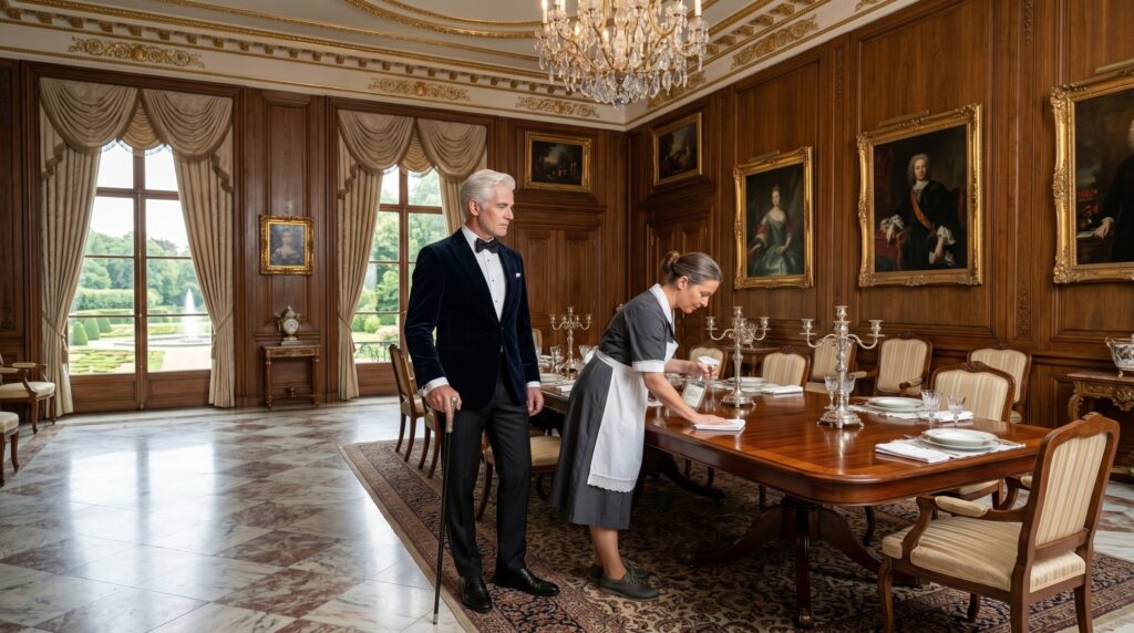 Llevaba su uniforme de servicio: un vestido gris sencillo, un delantal blanco impecable y zapatos de suela de goma para no hacer ruido al caminar. Sus manos, ásperas por los años de usar productos de limpieza y fregar pisos ajenos, colgaban a los lados de su cuerpo.
